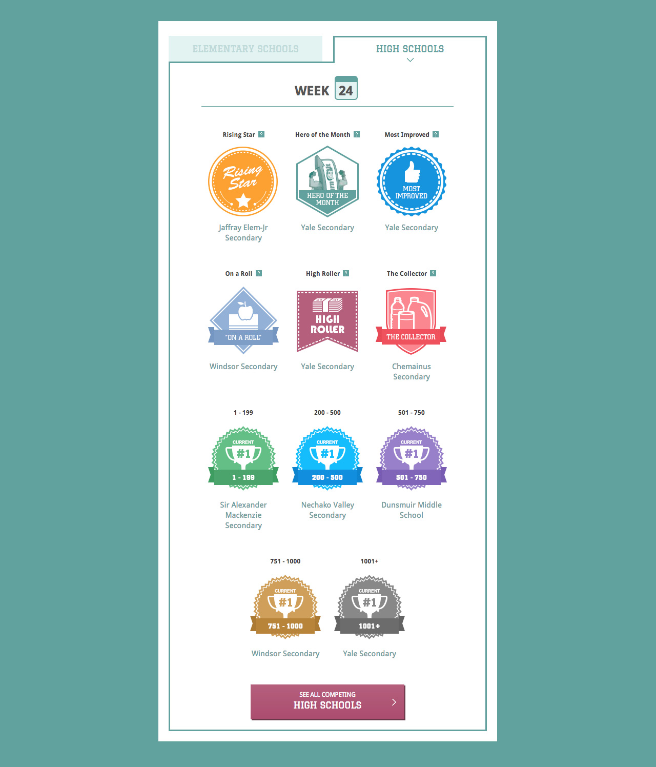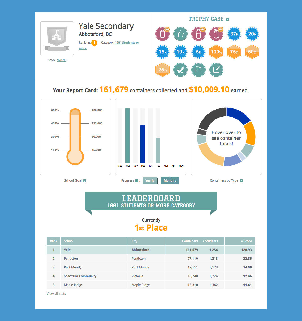 Recycling report card — Taking our learnings, we conceptualized and designed an interactive dashboard providing each participating school their own tailored profile with live, detailed statistics throughout the year. Tools such as goal setting and accomplishment trophies provided extra incentives for increased engagement.